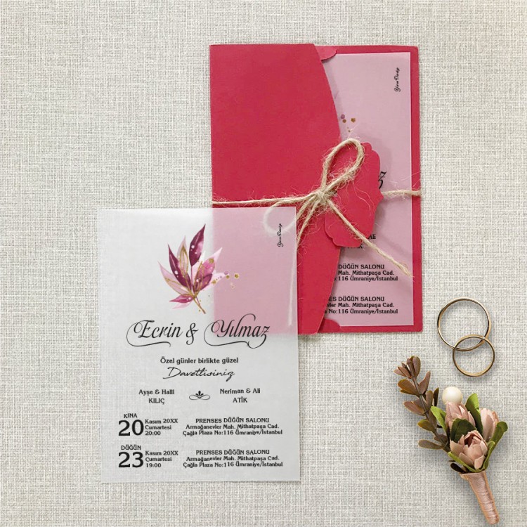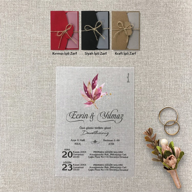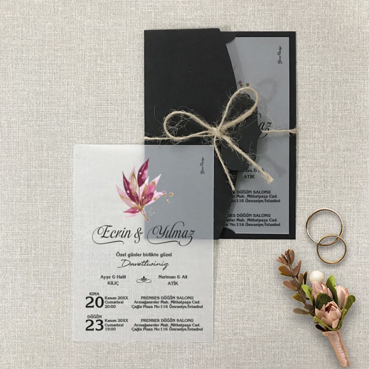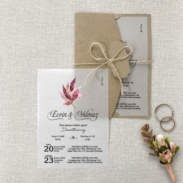 • Davetiye ölçüsü: 113 x 158 mm – Davetiye Kağıdı: 130 gr Şeffaf Aydinger Kağıdı